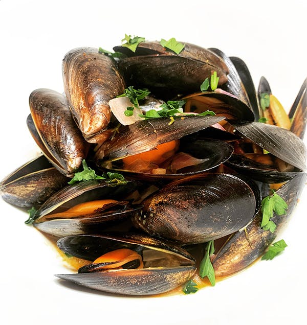 Mussels with a White Wine Tomato and Lemon Garlic Broth seasoned with Rosemary, Parsley, Sea Salt and White Pepper