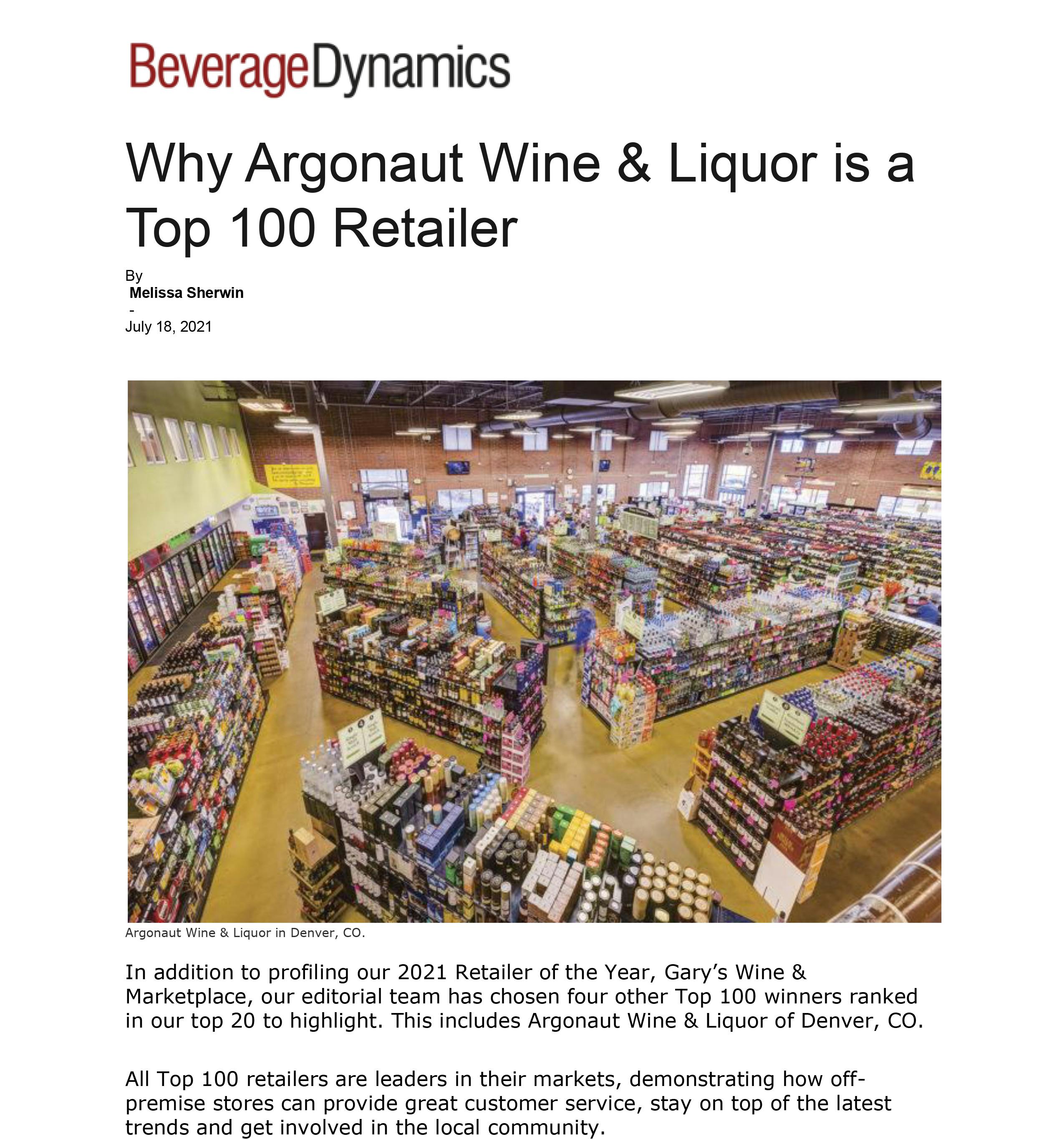 We’re proud to share some exciting news—Argonaut Wine & Liquor has been recognized as one of the Top 100 Retailers in the nation by Beverage Dynamics, landing in the coveted Top 20 nationwide. This prestigious honor highlights our continued commitment to exceptional customer service, an unmatched product selection, and our role as a community leader in the beverage industry.